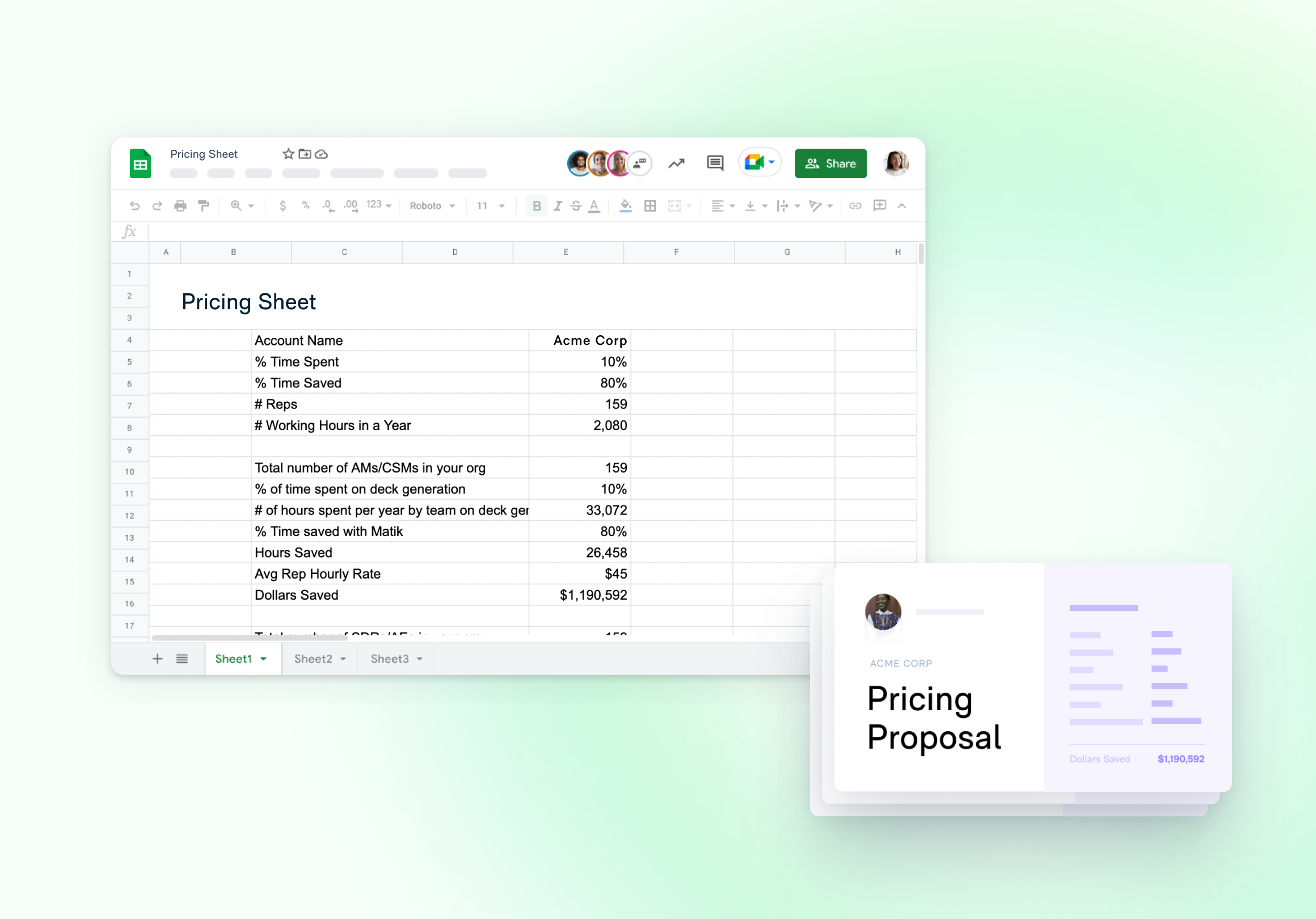 A top use case we see is customers bringing their pricing proposals, ROI one-pagers, and renewal decks to Matik, and linking them to a pricing calculator that is built out in a Google Sheet.