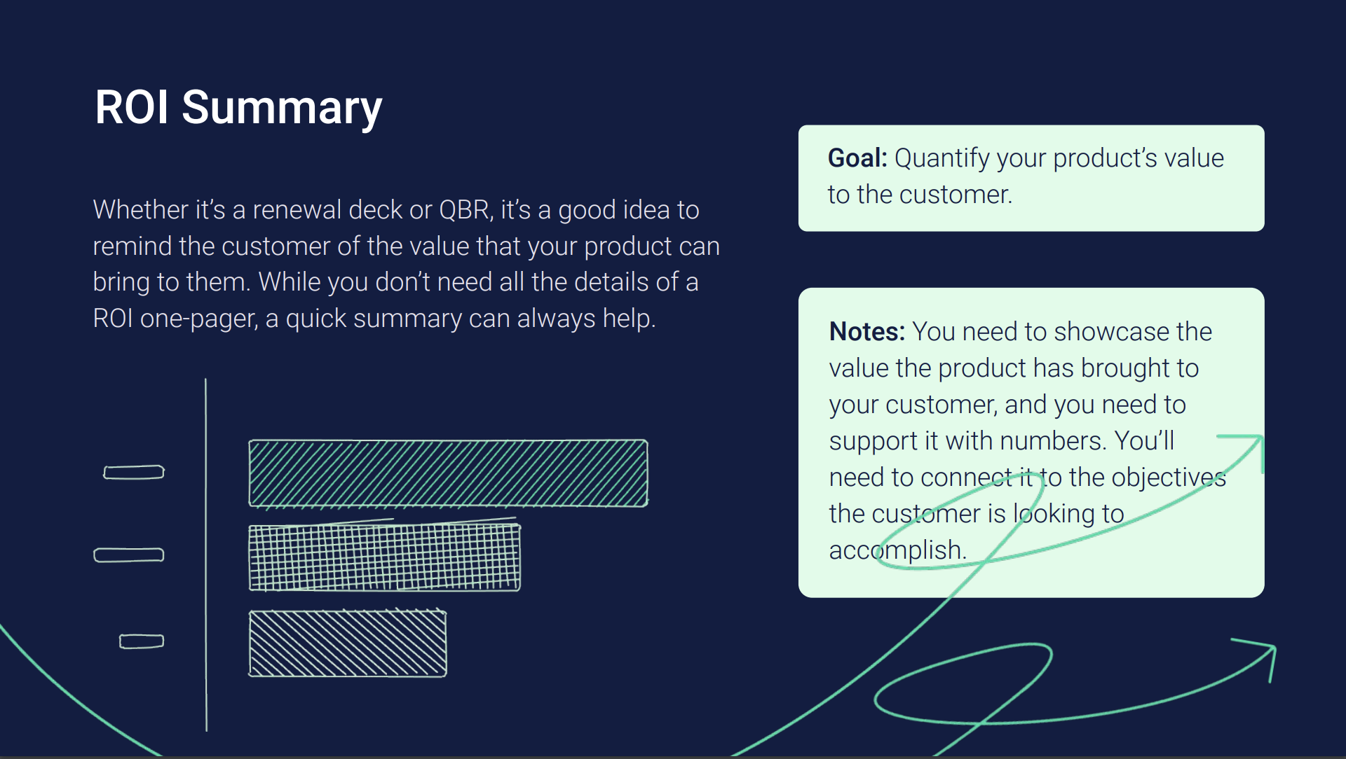 If it's Renewal Decks or QBRs, it's important to remind customers of the value your product provides. You don't need to include every detail from an ROI one-pager however, a concise summary will suffice. You need to demonstrate the value your product has delivered to the customer, backed by numbers. It's essential to link this value to the customer's objectives and goals.
