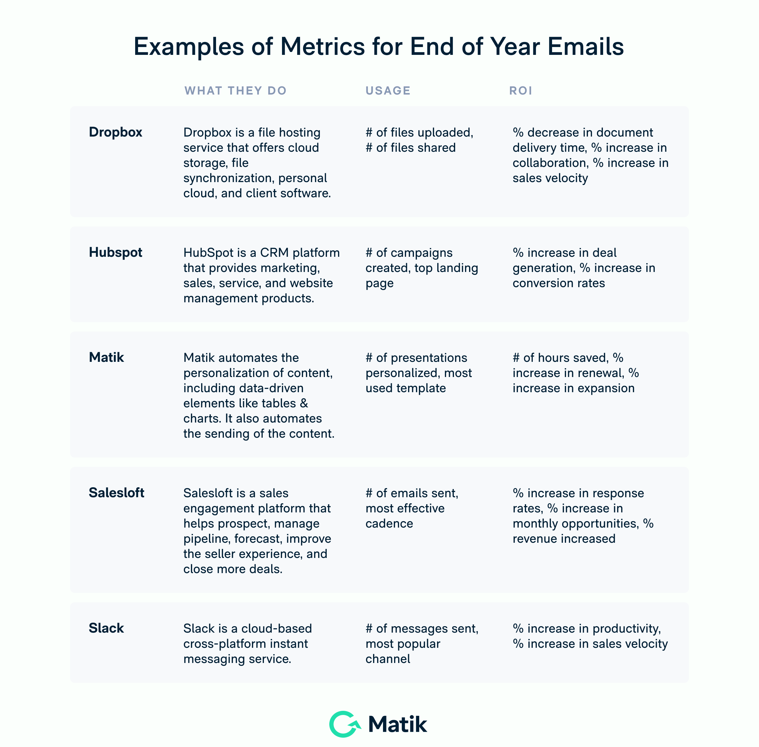 To help inspire you, check out the below graphic for example usage & ROI metrics real companies might use.