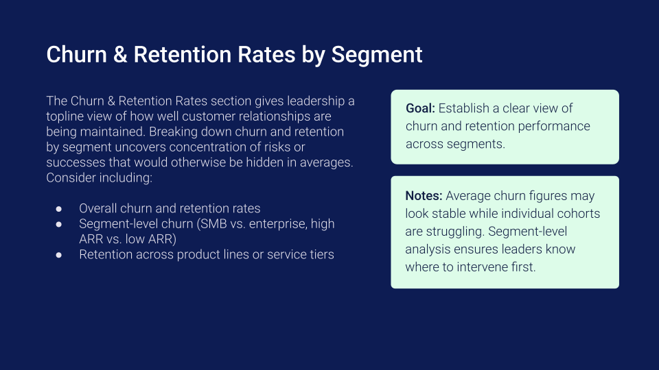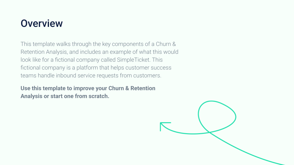 This template walks through the key components of a churn & retention analysis and includes best practices & example slides of what this would look like for a fictional company.
