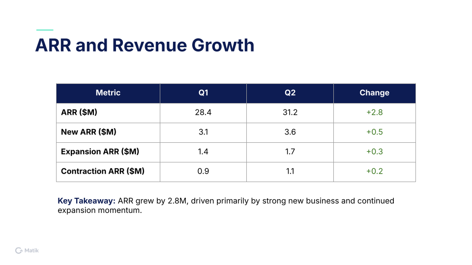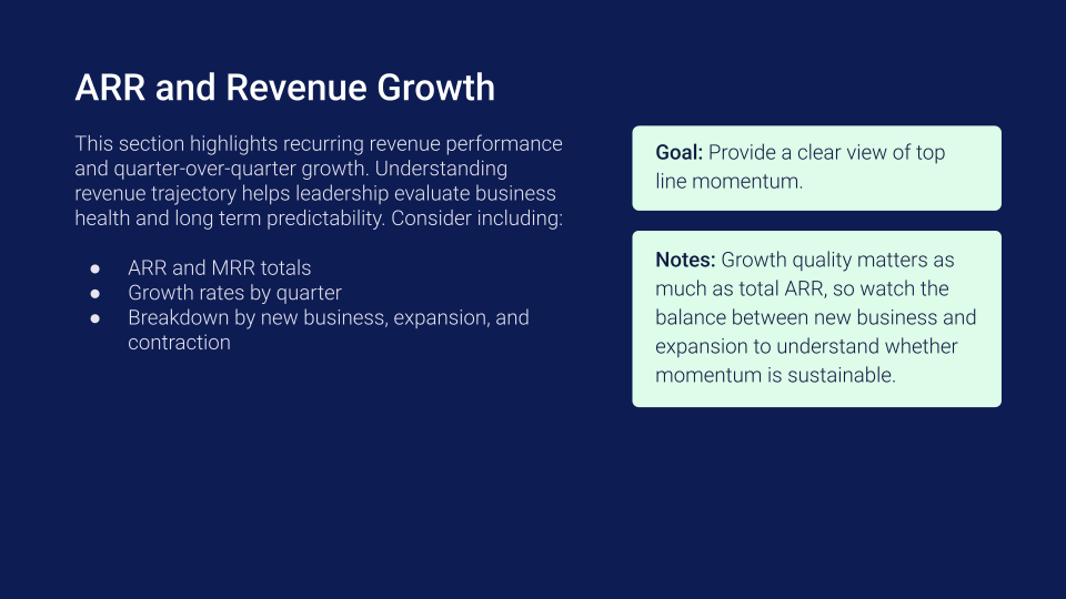 This template walks through the key components of a executive dashboard report and includes best practices & example slides of what this would look like for a fictional company.