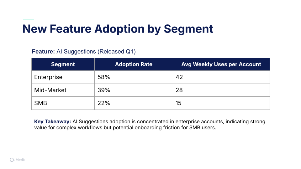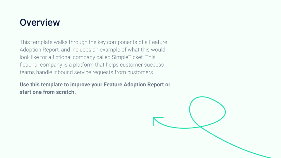 This template walks through the key components of a feature adoption report and includes best practices & example slides of what this would look like for a fictional company.